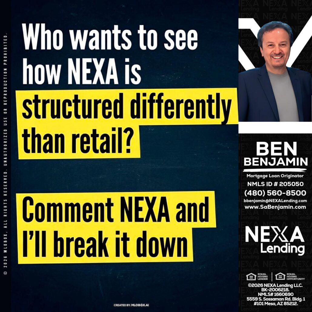 Hi, my name is Ben Benjamin. I’m a Loan Officer with NEXA Lending LLC., offering personalized mortgage solutions, fast customized quotes, great rates and service with integrity.